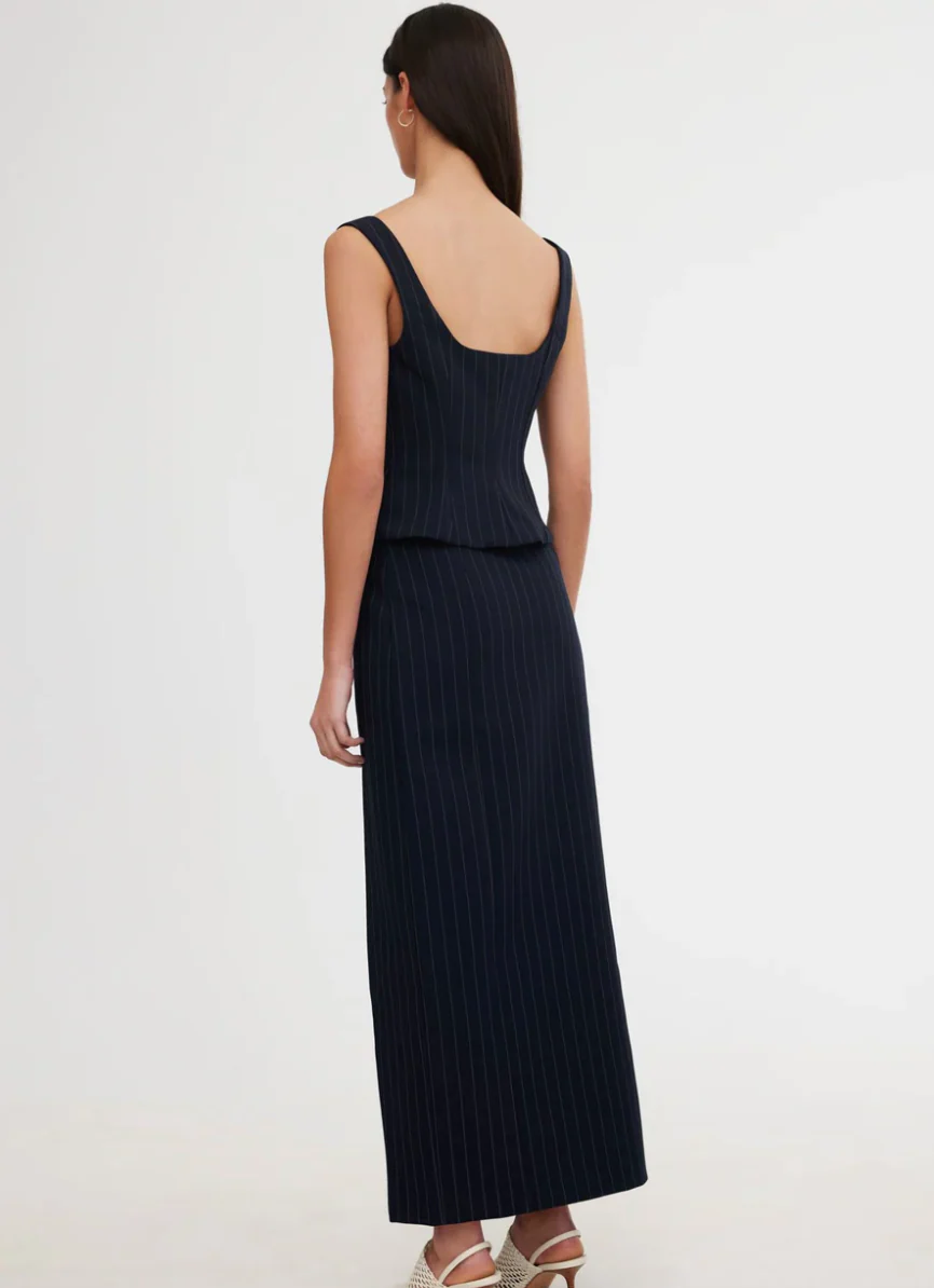 An updated silhouette inspired by suiting ~ the Sinead Skirt in Midnight Pinstripe is a classic piece. Crafted from a structured fabrication, complimented with a high waistline and centre front split. Pair with the Sinead Top for a complete look.